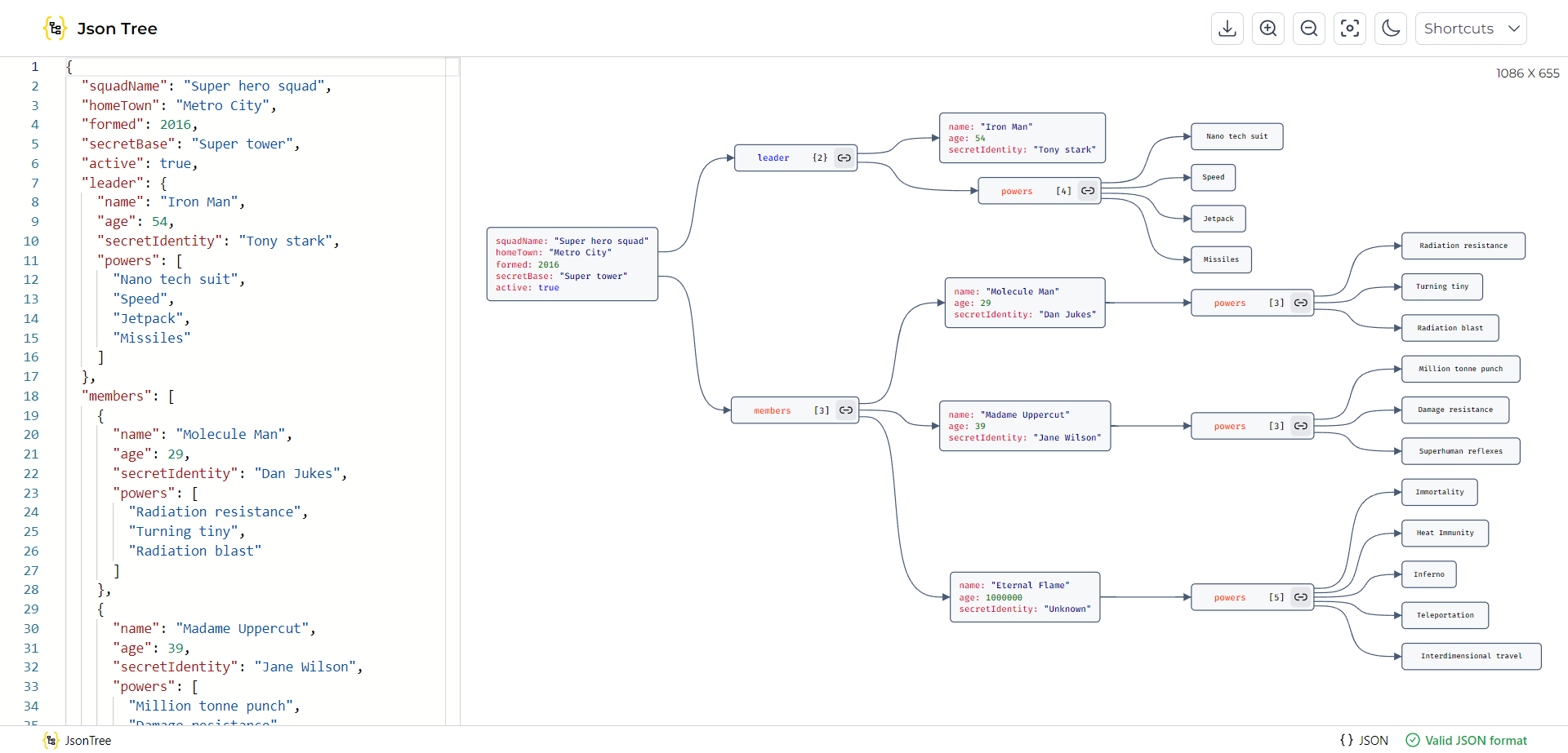 Visualize JSON data format in form of a tree or graph. Application is made using Nextjs, Tailwindcss and Monaco Editor. Design image can be downloaded from this app.